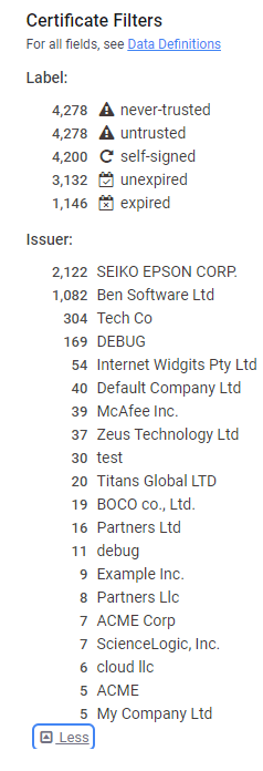services.tls.certificate.parsed.issuer.common_name:"*.*.*.*" AND services.tls.certificates.leaf_data.issuer.postal_code:* AND (services.tls.certificate.parsed.subject.organization:"co" OR services.tls.certificate.parsed.subject.organization:"llc" OR services.tls.certificate.parsed.subject.organization:"inc" OR services.tls.certificate.parsed.subject.organization:"corp" OR services.tls.certificate.parsed.subject.organization:"ltd" OR services.tls.certificate.parsed.subject.organization:"ACME" OR services.tls.certificate.parsed.subject.organization:"ACME co" OR services.tls.certificate.parsed.subject.organization:"ACME llc" OR services.tls.certificate.parsed.subject.organization:"ACME inc" OR services.tls.certificate.parsed.subject.organization:"ACME corp" OR services.tls.certificate.parsed.subject.organization:"ACME ltd" OR services.tls.certificate.parsed.subject.organization:"Partners " OR services.tls.certificate.parsed.subject.organization:"Partners co" OR services.tls.certificate.parsed.subject.organization:"Partners llc" OR services.tls.certificate.parsed.subject.organization:"Partners inc" OR services.tls.certificate.parsed.subject.organization:"Partners corp" OR services.tls.certificate.parsed.subject.organization:"Partners ltd" OR services.tls.certificate.parsed.subject.organization:"Tech " OR services.tls.certificate.parsed.subject.organization:"Tech co" OR services.tls.certificate.parsed.subject.organization:"Tech llc" OR services.tls.certificate.parsed.subject.organization:"Tech inc" OR services.tls.certificate.parsed.subject.organization:"Tech corp" OR services.tls.certificate.parsed.subject.organization:"Tech ltd")