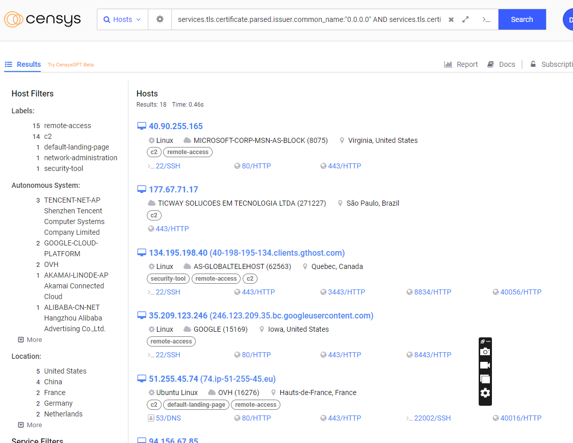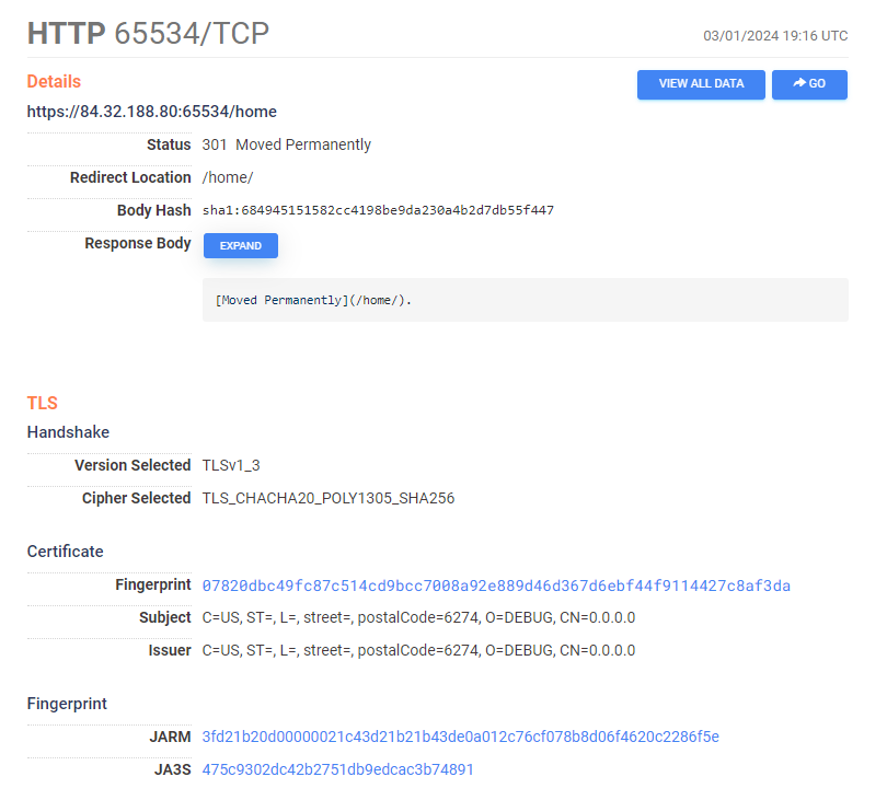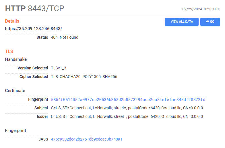 Altering the search slightly to wildcard the IP common name also proves fruitful. We find yet more untagged C2 IPs within Censys. Looking into the data we can see the Teamserver port running on a very high port number in an attempt to avoid scanners.