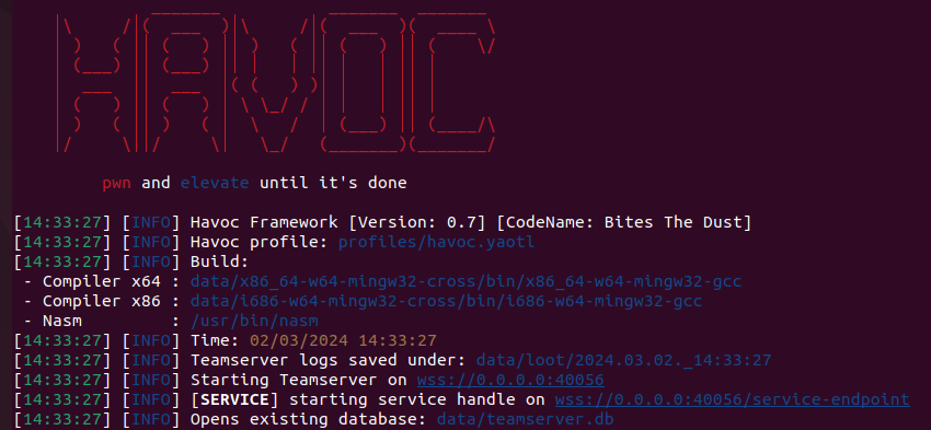 Once Havoc is installed, we can launch the Teamserver (again with the default profile supplied...
