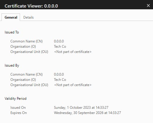 The "Tech Co" is of interest. I didn't add this at all prior to launching the team server. But the Common Name is also a fairly odd selection.