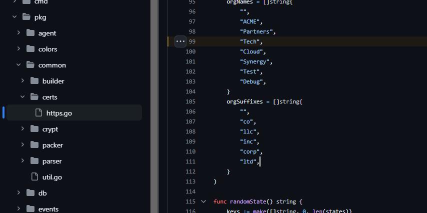 Code takes a prefix and a suffix to generate the org name. Eight options each including a null which equates to 64 potential names on certificates (inclusive of a "").