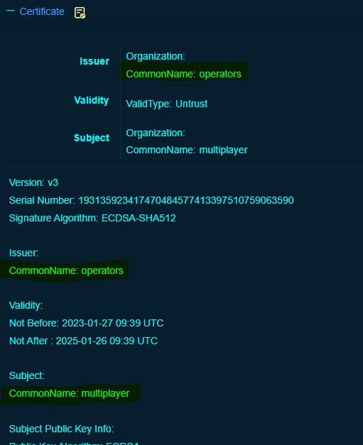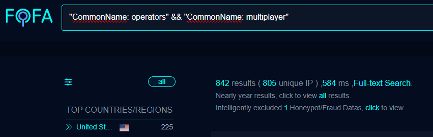"Operators" and "Multiplayer" should not be common names for certificates. Pivoting on this we can open up a search for where these two strings exist: