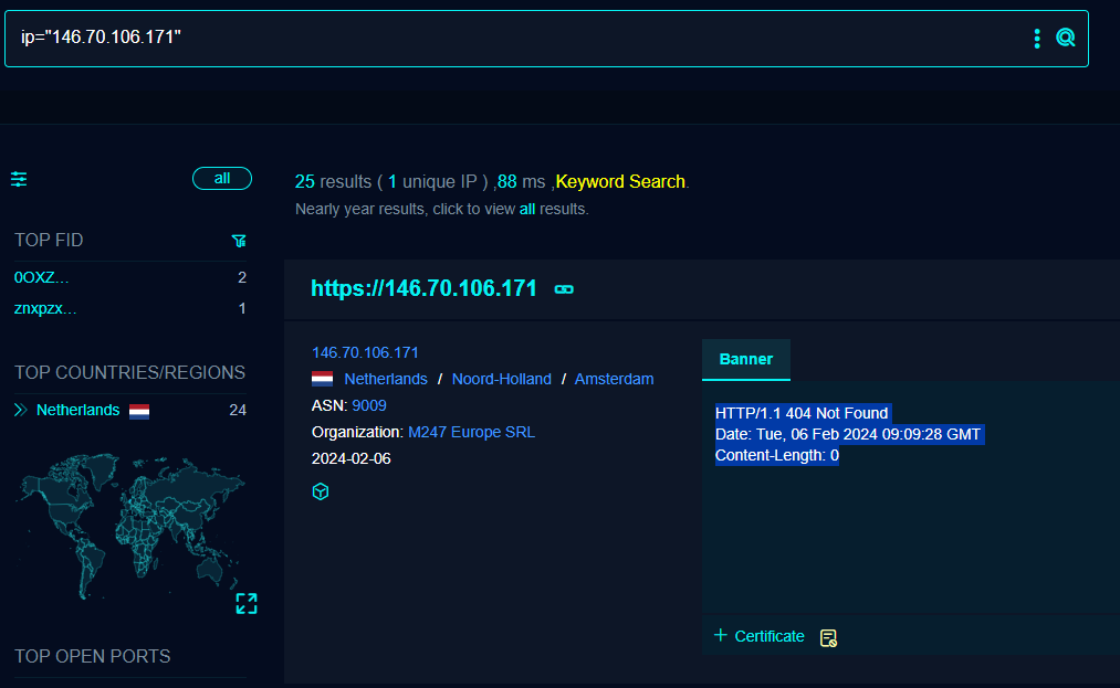 Delving into one of the results we can see the there is a content-length of '0' via a 404 on port 443, a common indicator of Cobalt Strike and Sliver being active. To add to this the certificate also matches the pattern.